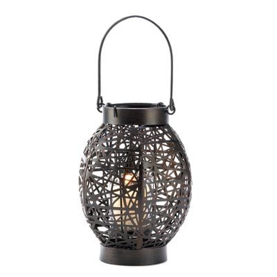 Delicate web work turns candlelight into an ever-changing pattern of shape and form. A functional piece of modern art that adds utter enchantment to your living space! Weight 0.8 lb. 5" diameter x 7" high; 11" high with loop at top. Iron and glass cup. Candle not included.