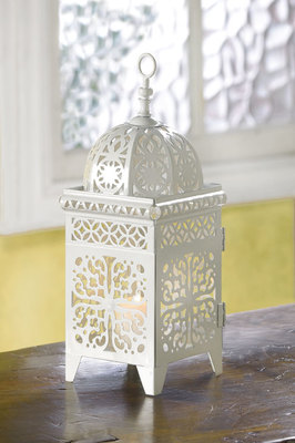 Bright white and intricate floral filigree add fresh appeal to this birdcage lantern! As candlelight shines through the cutout panels in a kaleidoscope display, your porch or patio comes alive with jubilant points of light! Metal. Candle not included. 4 1/4" diameter x 10 3/4" high.