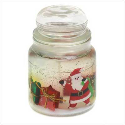 Shining presents and freshly fallen snow are the perfect scenic backdrop for Santa himself! Whimsical clear gel candle enlivens any decor with a festive Yuletide feel. Cinnamon fragrance. Holds 18 oz. Burns up to 150 hours. Made in USA. Langley candle. Weight 2.2 lbs. UPC# 644124512935. 3 3/4" diameter x 5 1/2" high. High density gel in glass jar. 3 3/4" diameter x 5 1/2" high. High density gel in glass jar.