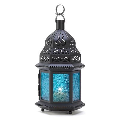 Ocean blue is the color of serenity, beautifully showcased in this intricate metalwork Moroccan lantern. Ornate cutouts allow a candle's golden light to provide a fascinating counterpoint of lacy light! Weight 1.2 lbs. 5 3/4" x 5" x 12 1/4" high. Candle not included.