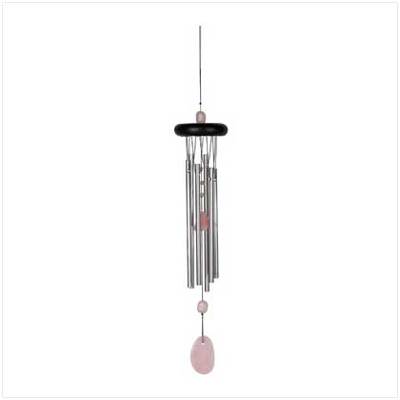 Fairy music floats on the breeze as this miniature chime weaves a spell of serenity. Real rose quartz and natural wood elegantly complement six shining metal chimes. Crafted by the artisans at Woodstock Chimes. Weight 0.6 lb. 2 3/4" diameter x 18" high. Wood and aluminum chimes.