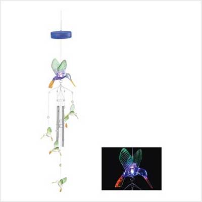 A bevy of colorful hummingbirds bobs against a springtime sky, sunlight sparkling from every crystalline facet. The battery-powered base sets the color changing shimmering light in motion on even the calmest day. Acrylic with metal chimes. Uses three AAA batteries (not included) 4" x 3 1/2" x 26 1/4" long.
