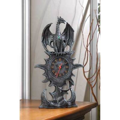 This dramatic mantel clock features a mythical winged dragon guarding the eternal hands of time. Golden roman numerals on the face of the battery-powered clock are the perfect accent to the steel-gray color of the clock and base, and a bright green jewel adorns the chest of the perched dragon.