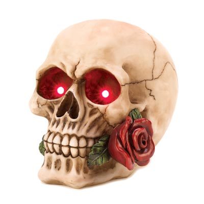 Like a chilling tattoo come to life, a ghastly skull clutches a blood red rose between its grinning teeth. This statue doubles its demonic appeal when you flip the switch and set the eye sockets evilly aglow! Weight: 1.0 lb. 6 3/4" x 5" x 5 1/2" high. Polyresin. Three AG10 button cell batteries not included.