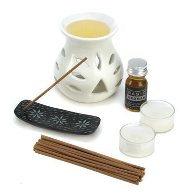 Set: 8?" x 7 1/4" x 2 3/4" high; Incense stick: 4 3/4" long; Oil warmer: 3" diameter x 3?" high; Incense burner: 1 1/2" x ?" x 4" long. Fragrance oil: 0.32 fl. oz.