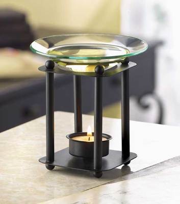 Four slender matte-black columns stylishly support a shallow glass oil dish; a tealight gently warms your favorite oil to disperse a subtle fragrance. Simple, contemporary styling is a fabulous fit for any decor! Metal with glass dish. 3 7/8" diameter x 4 1/2" high. Tealight and oil not included.