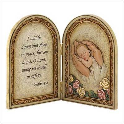 Beautiful two-panel plaque portrays a newborn safely asleep in the Lord's sheltering hands, tenderly illustrating the words of the accompanying Psalm 4:8 verse. A true blessing for the discerning decorator! Weight 1.8 lbs. Closed: 6" x 1" x 8 1/2" high; opened: 11 3/4" x 1/2" x 8 1/2" high. Polyresin.