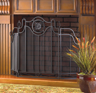 34770 Fireplace screen with cast iron medallion. Black metal. 44 1/2" x 1" x 30 3/4" high.