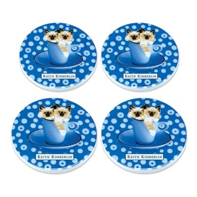 Two Siamese kittens are a sweet tea time treat, brightening this foursome of coasters with their adorable image. Sturdy glazed ceramic coasters with non-marring rubber feet. Weight 1.6 lbs. UPC# 746193717218. Each is 4 1/4" diameter x 1/4" thick. Ceramic. Set of 4