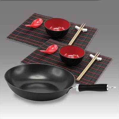 Let your culinary skills shine with this wok serving set! It includes a large wok pan to help you create a delicious meal, plus handsome accents that will help you serve your meal in style. The set features two black and red place mats, two bowls, two stylized soup spoons, and two pairs of chop sticks with chop sticks stands.
