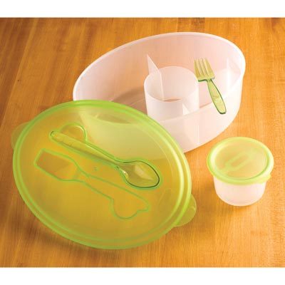 Enjoy a true moveable feast when you pack your meal in this clever divided container! Perfect for anyone who's constantly on the go, with three roomy compartments and a special lidded insert for condiments, dressings or even a tasty dessert. It even comes complete with coordinated reusable fork and spoon! 9 1/2" x 6 1/2" x 3" high.