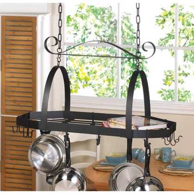 Keep your pots and pans at arm's reach while adding a lovely design accent to your kitchen with this decorative and functional hanging pot holder. It features multiple two-sided hooks to hang all of your cooking pots plus has storage capabilities on top for cookbooks, cooking utensils, and more.