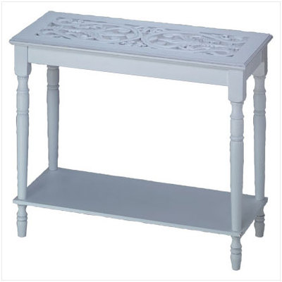 34709 "Shabby elegance" table with turned legs and intricate carvings. Wood with distressed white finish. 35" x 14" x 29" high.