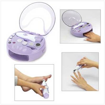Enjoy a salon quality beauty routine without the premium prices! Handheld power buffer rubs away rough spots and perfectly files nails; the base dries wet polish in nothing flat. You'll look and feel like a pampered celebrity! Includes assorted tips for a complete manicure or pedicure: fine grit and buff for nails, fine and filing, nail polishing, shape and round cone grinder, fine grain cone, 3 metal-coated dead skin remover, cuticle lifter, and cordless power handle. Weight 1 lb. Plastic. Two AA batteries not included. 7" x 6" x 2 1/8" high.