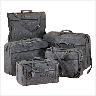 21943 Sturdy 5-piece travel set is just the ticket for vacations, business trips or weekend jaunts. Jute tweed set includes 2 Pullmans (28" x 20" x 8 3/4" and 26" x 18" x 8"), Duffle Bag (21 1/2" x 12" x 11"), Carry-On (21" x 16" x 8") and Garment Bag (44" x 23" x 3"). Vinyl trim. Dark gray "tweed."