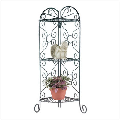 27128 Collapsible 3-tier shelf, verdigris finish over metal. 12 1/2" across, 9" deep and 30 1/4" high.