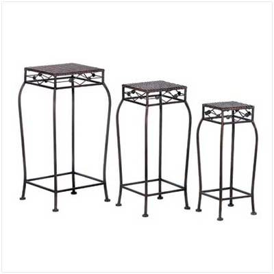 Old World elegance galore! With rich burnished coloring, graceful shapes and three graduated heights, these handsome stands transform your favorite plants into an instant artistic display. Weight 10 lbs. UPC# 817216010422. Small: 8 1/4" square x 21 1/2" high; medium: 10" square x 24 3/4" high; large: 12 1/4 square x 28" high. Metal with PE rattan. Set of 3