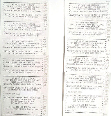 Listing includes: 10 coupons for $10 off any $50 or more in store purchase (codes are written down but covered) coupon expiration date is: there is NO EXPIRATION DATE (great for holidays or their semi-annual sales) Coupons are valid at any Victoria Secret store nationwide