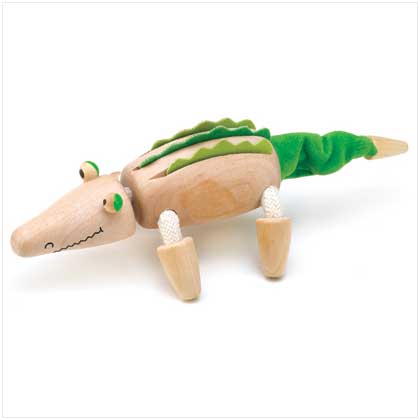 crafted from natural wood and textiles, this cheerful crocodile keeps
