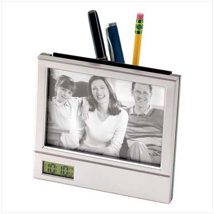 easy reach! Handsome silver-finish photo frame has a digital clock and
