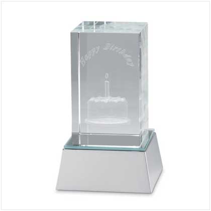 "Happy Birthday!" LED base. Uses 3 AAA batteries (not included). Glass. Measures: 2 1/2" square x 4 3/8" high.