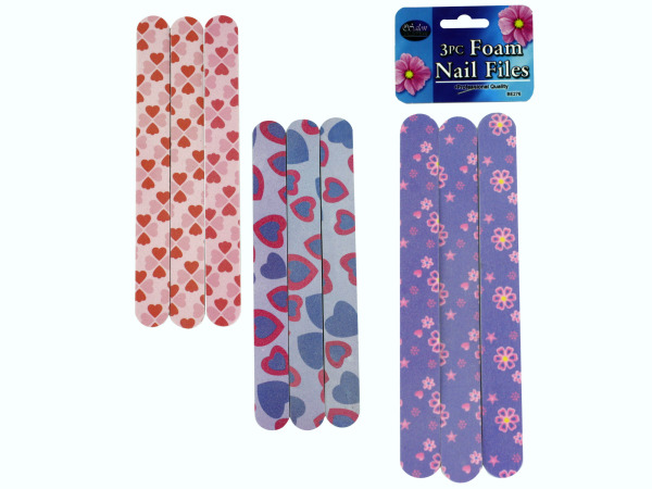 Foam nail files are double-sided, come in fun designs and can be used at home or professionally. Design assortment includes flowers and hearts. Each set comes with 3 nail files. Comes packaged in a poly bag with header card. Files measure 3/4" x 7". This item is sold as an assortment. There are no options to choose from, the shipment will be based on what is available at the time of order.; Colors: green,gold,pink; Materials: foamIf there is a color/size/type option, the option closest to the image will be shipped (Or you may receive a random color/size/type).