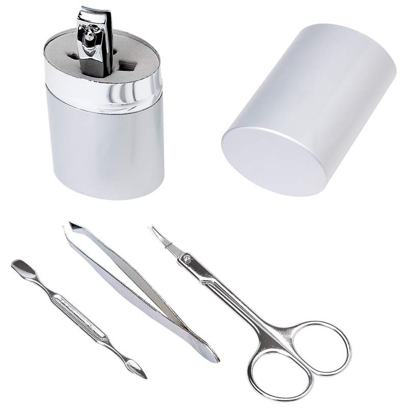 Stored in a beautiful aluminum cylindrical case, this set includes: tweezers, cuticle scissors, nail clippers, cuticle pusher, and nail cleaner. Cylinder measures 4-5/8" tall.