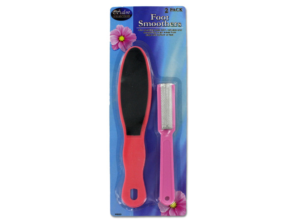 Foot smoothers are ideal for removing dead skin, calluses and smoothing rough areas from sides and bottom of feet. This set of foot smoothers comes with a plastic double-sided file and a steel rasp with plastic handle. Color assortment includes blue and pink. Instructions for use and care are on back of card. Item is packaged on a blister card with hanging hole. File measures a little of 8 1/2" long, rasp measures 6 1/2" long. This item is sold as an assortment. There are no options to choose from, the shipment will be based on what is available at the time of order.; Colors: black,white,blue,silver,pink; Materials: metal,plasticIf there is a color/size/type option, the option closest to the image will be shipped (Or you may receive a random color/size/type).