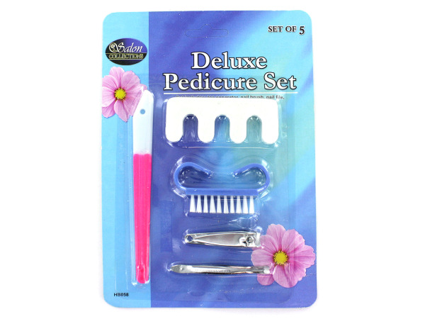 Save money and do your own pedicures at home with this useful set. Includes all the tools you need for a beautiful at-home pedicure including a toe separator, nail brush, nail file, nail clippers and tweezers. Set is packaged on a blister card with hanging hole. File measures 5", separator measures 3", brush measures 2 1/2", nail clipper measures 1 3/4" and tweezers measure 2 1/2". This item is sold as an assortment. There are no options to choose from, the shipment will be based on what is available at the time of order.; Colors: white,blue,silver,pink; Materials: metal,plastic,foamIf there is a color/size/type option, the option closest to the image will be shipped (Or you may receive a random color/size/type).