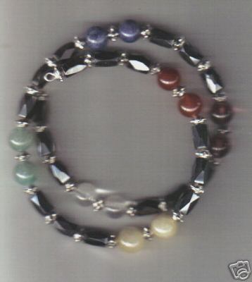 This Double set of Chakra Healing Stones and Magnetic Hematite combine to form a powerful bracelet. It is on memory wire with a silver clasp for extra security. Magnetic Hematite is widely used to align the body's bio-magnetic fields and assist the circulatory system. I use it on a daily basis to recuce pain and swelling in my hands.