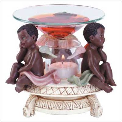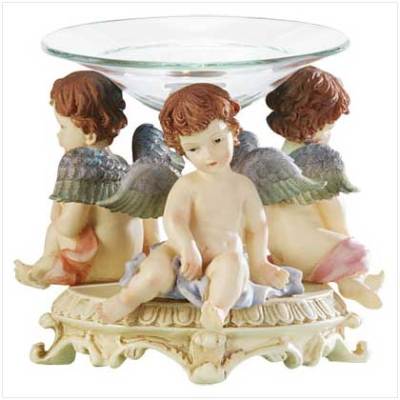 Happy angels hold a glass dish of sweet-smelling oil aloft on their