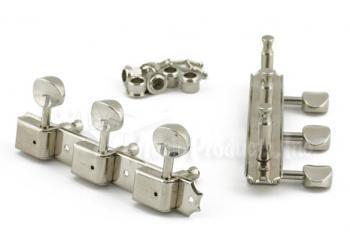 Kluson replacement for Gibson Melody Maker, Les Paul,Les Paul jr., SG. Key dimensions- total center to center distance of all 3 posts- 2 3/4 in., center to center distance between posts - 1 3/8 in., length of baseplate- 4 1/4 in., post height- 1 in., drilled post, single hole, post dia. 6 mm (.236 in.) This is a complete set and comes with both left and ride side tuners. Also comes complete with bushings and mounting screws. |