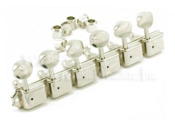 Kluson 6 On a Plate Tuners in Nickel/Oval Metal Button. Replacement for Gibson 12 string, Explorers, Non-Reverse Firebirds, Trini Lopez, Epiphone 12 string Riviera, etc. "Kluson Deluxe" is stamped in 2 lines on casing. Use with SD91MLN R DR for 12 string applications. |