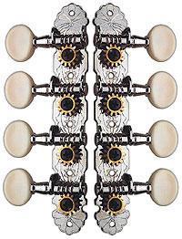 Elegant mandolin tuners, four on a plate. Nickel with white pearl buttons. |