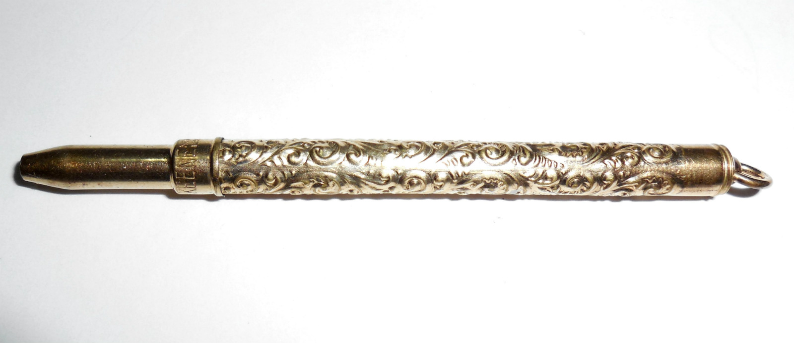 A fancy 1920s fancy Victorian repoussed lady's mechanical pencil for a sewing chatelaine, necklace pendant or pocket watch fob. Never monogrammed. Made by Keene of New York and in excellent condition. It has a twist mechanism whereby the lead protracts and retracts when you turn the repoussed top. Size is 3 1/8" long including the loop bail at the top. It has thick lead and was likely originally intended for marking fabric or labels. From a bygone era of long ago this is one of those exquisite items made exclusively for women.