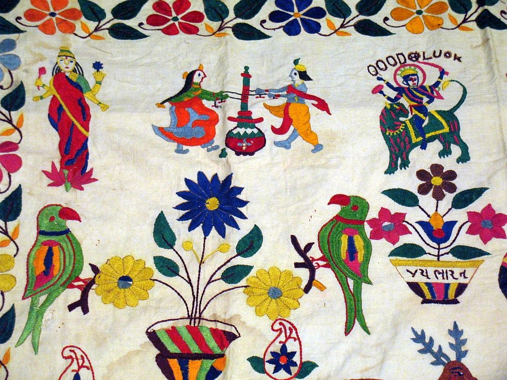 The "Banjara" style is one of the most prized styles of hand embroidery, never seen in any departmental store in the U.S and limited to collector's sites. What distinguishes this memorable style of embroidery is the fact that it covers every inch of fabric with exuberant colors of rural western India.This lovely picturesque hand crafted & 100% hand embroidered Toran / Valence is a visual delight.