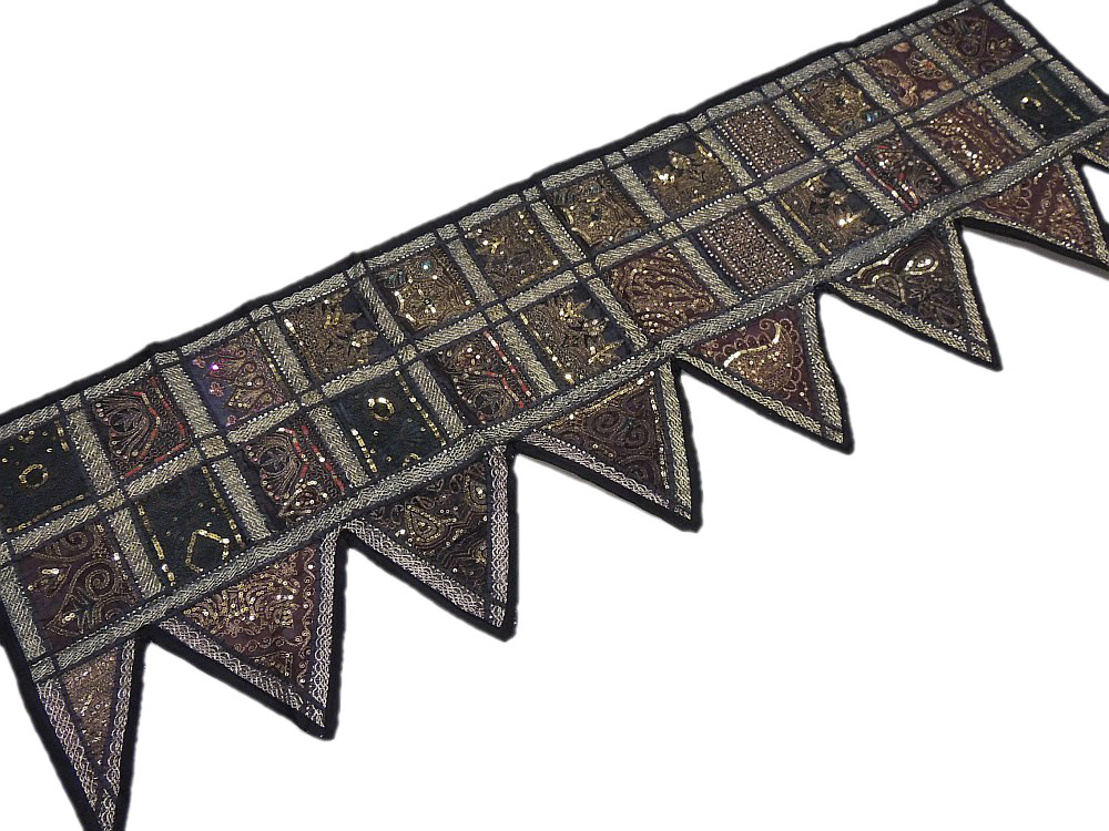 Black and dark Chocolate Embroidered, Beaded & Sequin work Sari Indian Toran / Valance / Window or Door Topper / Tapestry Wall Hanging (with 8 pods) from Gujarat, India. Size: L 58in x 20in NH14663