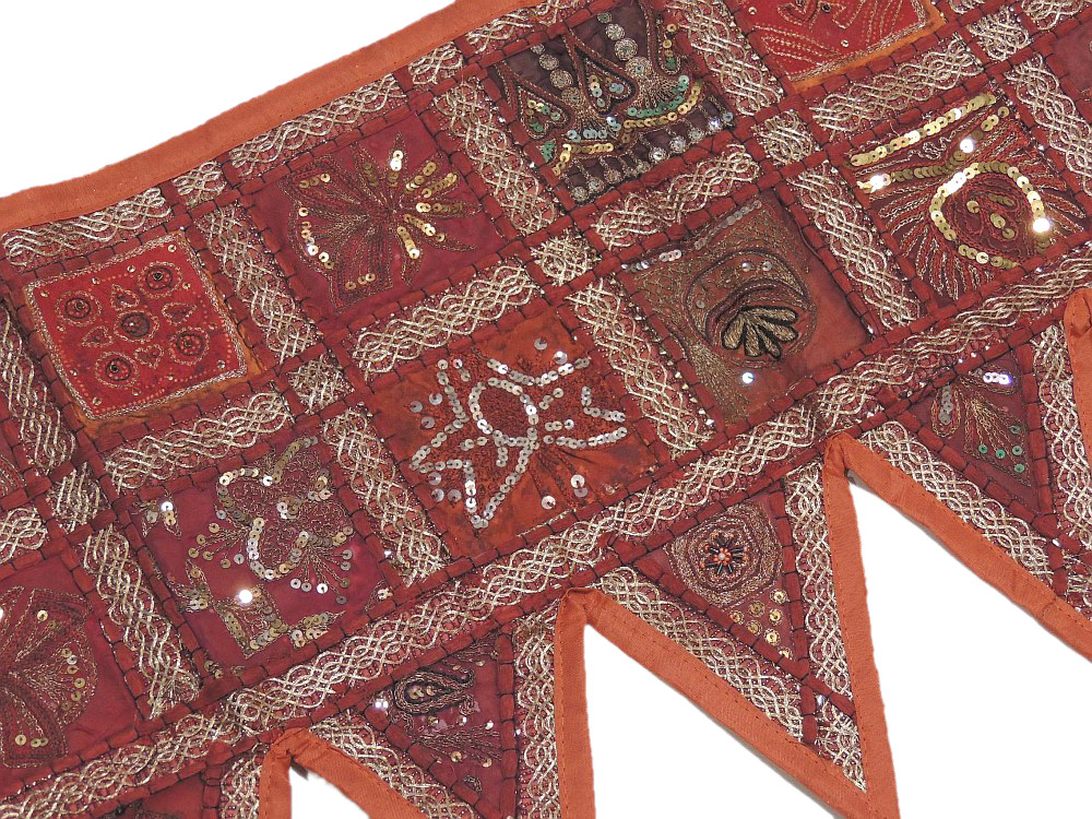 Exquisite Russet, Maroon and Chocolate Hand Embroidered, Beaded & Sequin work Sari Indian Toran / Valance / Window or Door Topper / Tapestry Wall Hanging (with 8 pods) from the state of Gujarat in Western India, Size: 40in x 15in
