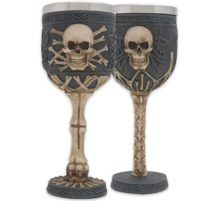Enjoy your beverage as you sip in style! This set of cool drinking goblets features skulls and crossbones on the cold cast resin top sections. Arm bones make up the stem and base of each goblet. The stainless steel inner liner helps keep your drink cool. Each goblet measure 6" tall, and 2 1/4" in diameter. Each goblet is made of cold cast resin.