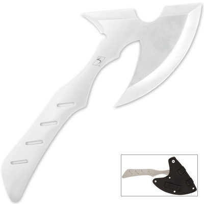 Constructed from solid 420 stainless steel. Designed to slash through the air and nail the bullseye with ease. Includes custom sheath. 5 3/8" blade, 11 3/8" overall