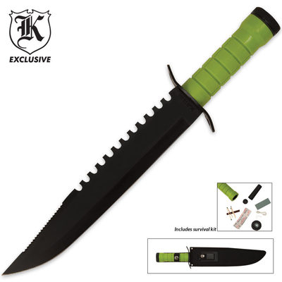 This Apocalypse Survivor Bowie features an 11" 3CR13 stainless steel blade with double sawback serrations. This Bowie includes a survival kit in the handle as well as a sharpening stone that is stored in the included nylon sheath. 16" ov.