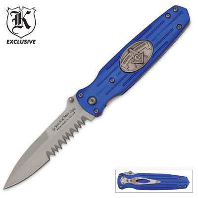 This rough and tough tactical folder is designed for superior performance for the Free Mason. The 3 1/2" blade is solid AUS-6 stainless steel construction with blade serrations. The impact resistant blue aluminum handle is equipped with the Masonic crest and a pocket clip. 8 1/8" ov.