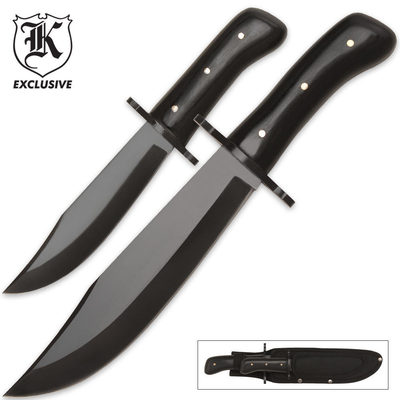 Tired of not having a Bowie that is just the right size? With this two piece Bowie set, you can have two different sized Bowies for the price of one! This set includes a small Bowie (5 1/8", 9" ov) and a large Bowie (8" bl, 12 7/8" ov). Each knife features a black-coated stainless steel blade and a black hardwood handle with brass pins. Includes a durable nylon sheath that holds both Bowies.