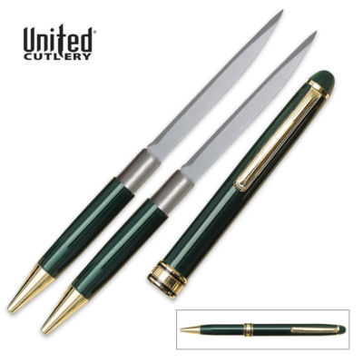 This Auction is for two New In Box Pen knife! A functioning ink pen with a very convenient envelope-letter opener and a gold-tone plated pocket clip, center band, and clip. Twist pen to extend pen point or pull apart to reveal a 2 1/2" blade. This is a 5 5/8" overall length pen and refillable inks can be found on most popular office or department stores.