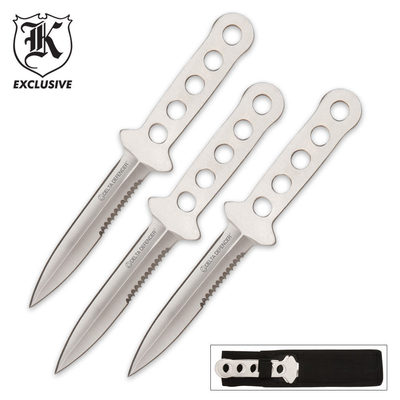 Dive into this exclusive new set only from BUDK! This set of diver knives includes three AUS-6 stainless steel partially serrated diver’s knives. Each knife measures 10", and bears a Delta Defender etch. Includes custom nylon sheath for storage and carry.