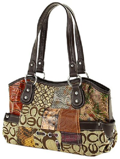 . 13" X 8" X 6", patchwork look, zipper pull, metal studs, zippered inside pocket, fully lined.