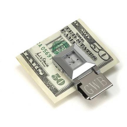 Time truly is money with this luminous clock and stainless steel money clip combo. The compact, stainless steel timepiece, with dollar-hugging grip, fits safely in any pocket, guarding your cash without the bulk of a billfold. Personalized with two lines of up to 12 characters per line.