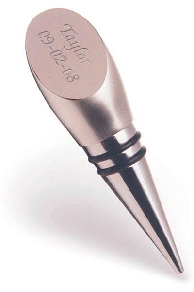 Wine connoisseurs know a good wine by its bouquet, and a good stopper by its style. With its stainless steel design and an engraved, personalized top, share the joy of your celebration with this keepsake gift. Personalized with two lines of up to 12 characters per line.