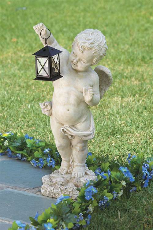 Crafted of stone-finish polyresin and metal, the cherubim lantern is perfect for the entryway, patio, or garden path. Uses tealight candles only (not included). Measures 10" x 10 1/2" x 25" high.