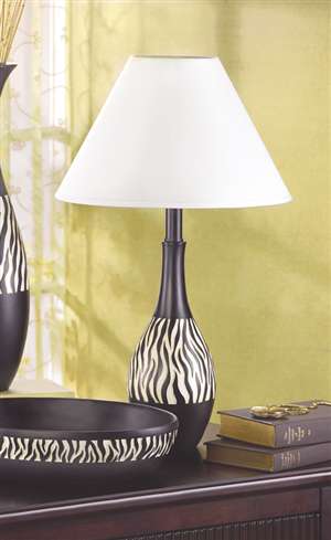 Striking stripes of black and white add adventurous appeal to this jug-shaped lamp. Polyresin base, white fabric shade. Uses 60-watt bulb (not included). Measures 12" diameter x 20" high.